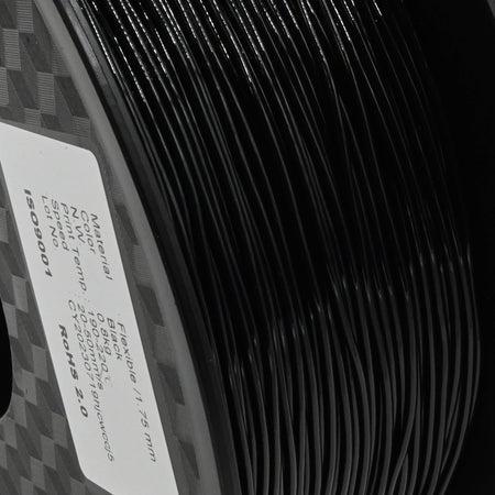 Black Flexible filament for open source 3D Printers. High quality, constant diameter, bright uniform colours for accurate repeatable prints. The filament comes on a plastic spool and is sealed in a plastic bag with desiccant and packaged in a box (sometimes we remove the filament from the box to fit everything into your parcel). Each spool is marked with the type of filament, the recommended printing temperature and the manufacturing batch number. We have a lot of confidence in the filament we supply, because we use it ourselves.
