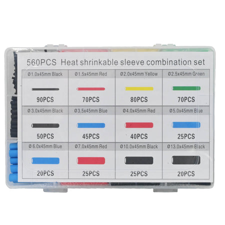 This is a very handy Heat Shrink Kit in a nicely packed container to insulate electric wires. The kit consist of 560 pieces of various sizes and colours heat shrink. The heat shrink are all 45mm long.